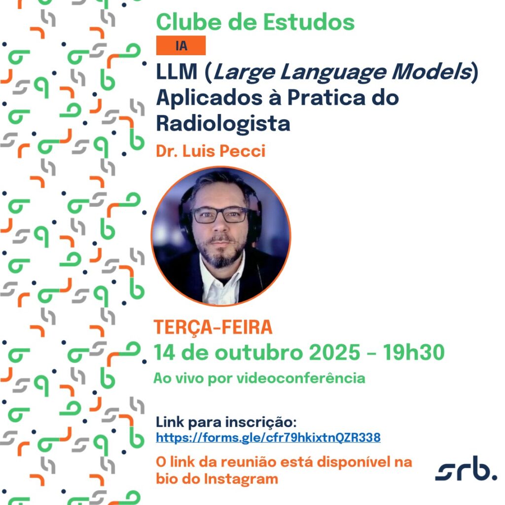 No dia 14 de outubro de 2025, às 19h30, ele abordará o tema “LLM (Large Language Models) aplicados à prática do radiologista”, explorando o uso da inteligência artificial na rotina médica e seus impactos na radiologia moderna.